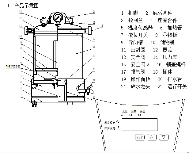 “水位”指示燈:通電后,在桶內(nèi)沒有水(或水位低于保護(hù)低水位)時該燈亮,顯為紅色,同時機內(nèi)蜂鳴器鳴叫;當(dāng)桶內(nèi)的水位高于低水位時,指示燈轉(zhuǎn)為綠色,可以進(jìn)入加熱狀態(tài)。但是,這并非表示桶內(nèi)的水量可以滿足整個滅菌程序的需要。滅菌起始水位一定要按示意圖的要求加到規(guī)定的位置。